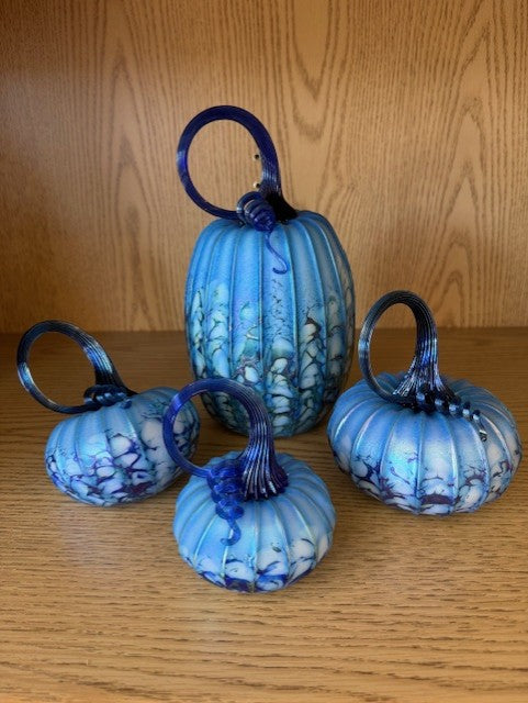 Fantastic pumpkins in blue, white, orange and gold - all glass-blown and gorgeous! Add a touch of elegance to your table and for Thanksgiving or to your Fall home decor. These delicate beauties are wonderful to collect or amazing to give.